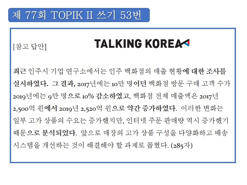 [작문] Đáp án gợi ý cho môn viết câu 51, 52, 53, 54 TOPIK kỳ 77 (최초 공개: 토픽 제 77회 쓰기 참고 답안)